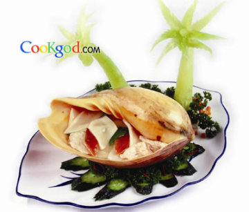 1、将海螺硬皮割掉,去掉内脏,洗净,切成薄片,下入沸水中焯烫透,即刻捞出,沥净水分备用。