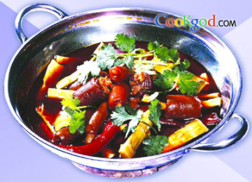 2、锅中加红油烧至六成热,小火炒香郫县豆瓣酱,加干辣椒、泡辣椒、花椒中小火炒香,再入牛尾、笋子、盐、白糖、鸡精、胡椒粉、料酒、酱油、水1500克,盖上盖儿小火烧2小时入味。
