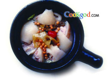 2、取一煨汤罐,加入骨头汤,放入猪手、黄豆、酸菜、盐、鸡精,用微火煨3小时至猪手软烂离骨,加入味精调匀上桌即可。