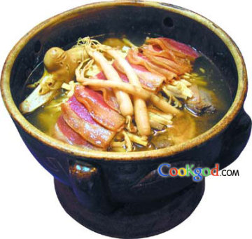 3、将鲜笋、排骨、金华火腿、沙参、人参、枸杞、红枣依次放入古子中,后将老鹅码放在最上层,再放入黄酒、生姜、葱段。