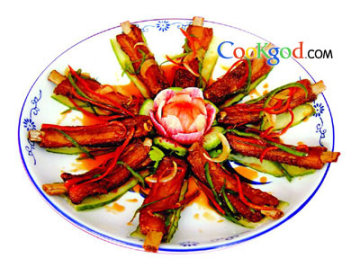 粤菜中有道名菜叫“桂氏蛇段”,由于蛇段现在不让烹调了,所以用排骨代替。另外,选用川味卤水来卤制,使菜肴更加贴近四川人的口味特点。