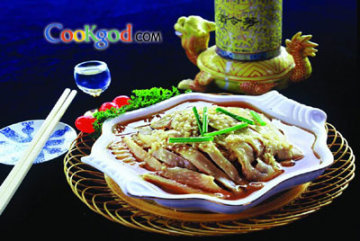 2、香芹段打底,鸡肉放香芹上,将鲜汤放入沙姜、蒜、生抽、糖、盐拌匀,淋至鸡肉上,撒葱叶即成。