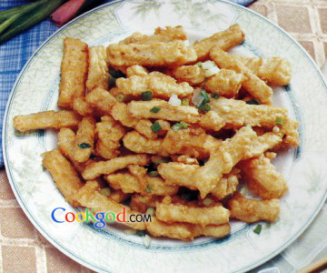 2、碗内打入鸡蛋,放入山药条裹匀,下热油锅炸至色金黄时捞出。
