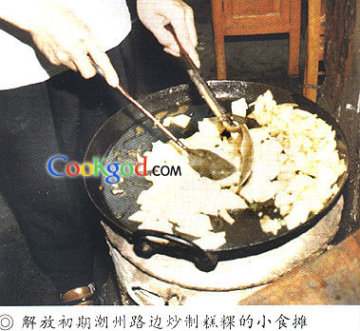 粳米先磨成粉浆,粉浆中加适量的矾。把粉浆先倒一部分在垫有白布的蒸笼中,先蒸熟第一层,再倒入粉浆,蒸熟第二层,如此反复—下去,一直蒸至有10厘米厚左右。把蒸熟的粿置放到第二天,使其变硬,切成三角形的小块。洗净锅,放炉上热油,放下粿块,调入盐水、咖喱,炒好后装盘;再把香菇、虾米、鸡蛋、猪肉炒香勾芡,淋在炒好的粿块上。装盘以后有的还撒上白糖粉。