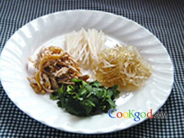 盐焗手撕鸡连皮75克,水发散翅50克,绿豆芽50克,香菜25克。调料白芝麻0.5克,沙姜油2克,上汤500克,盐1克,姜水2克,色拉油2克,盐焗鸡原汁10克。