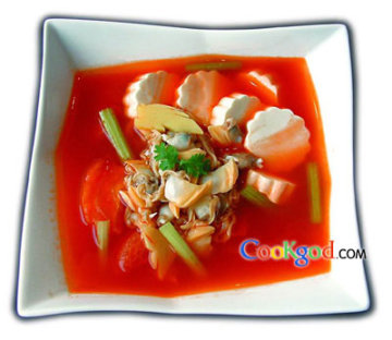 盒装豆腐100克,土芹25克,鲜花甲肉(即蛤蜊肉)150克,鲜番茄1个(重约30克)。调料二汤500克,姜片15克,番茄酱25克,牛油10克,盐5克。