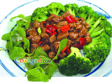 1、牛仔柳洗净,切成1厘米见方的小粒,加盐3克、味精5克、生抽、湿淀粉调味后腌渍10分钟备用;西兰花洗净,切重约5克的块,放入沸水中加色拉油5克、盐2克大火汆1分钟,取出控水,装入盘中围边。