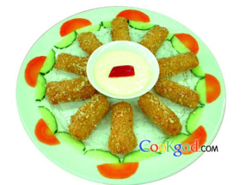 2、将炒好的原料分成10份,用威化纸包裹后裹上生蛋黄,粘匀面包糠,放入烧至五成热的色拉油中小火浸炸3分钟出锅,装盘,跟色拉酱蘸食。