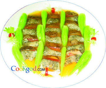 2、将鱼皮、火腿片、花菇片放碟中摆成麒麟形,放入盘中大火蒸5分钟后出锅。