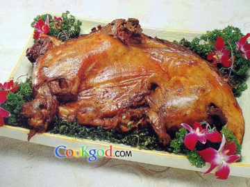 2、将卤制好的羊烤至表皮呈金黄色,改刀装盘即成。