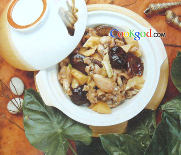 3. 烧热瓦缸,下油,下姜、葱爆香,续下田鸡同爆,洒点白酒,加入冬菇及一碗清水,调适味同煲十五分钟,用些生粉作芡,下些熟油拌匀即成。