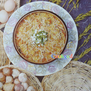 2、将禾虫、叉烧丝、油条、陈皮丝、炸蒜子、鸡蛋、二汤100克和所有味料一齐放入瓦钵里,用筷子拌匀,放入蒸笼用中火蒸熟取出,再原钵放在炉上慢火据全香,再将炸粉丝和葱花放在面上便成。