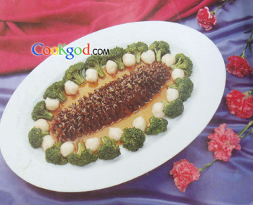 1、将海参用姜、葱、绍酒煨过取起待用。把瘦肉、虾米剁烂拌入味料,然后酿入海参的腹腔内,入蒸笼蒸熄后上碟排好。