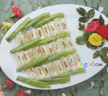 (3)将片好的石斑鱼肉,在中间放上火腿、厚菇、冬笋、芹菜,然后卷成卷筒状,鼎再烧热,放入生油,候油温热至约180℃时,把鱼卷逐件蘸上鸡蛋白放进鼎内炸熟,捞起。再把油倒起,将鱼卷倒回,把已调味好的湿粉水对入鼎间搅拌均匀,将鱼卷逐件排放在鱼骨上,再把菜薳炒熟拌围在鱼的周围即成。