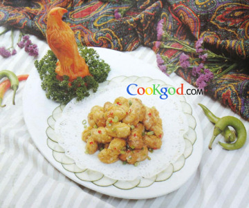 3、烧镬落油至210℃,放入上好粉的鸡子炸至金黄色捞起。将油倒回油盆,利用镬中余油放料头、椒盐、鸡子爆香,烹绍酒,炒匀盛于碟中便成。