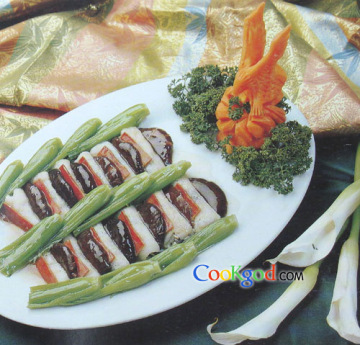 2、将发菜、金菇和匀,酿入竹笙内。然后分别用北菇,火腿片相间排放在长碟上,放入蒸笼蒸5分钟取出,倒去汁,