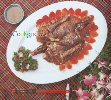 2、在鹅身抹上猪油,将鹅蒸熟至够身,取出。把熟鹅腔内梅汁倒出,用刀把鹅斩件盛碟上,按原鹅造型,将梅汁入镬用水调生粉打芡,另用小碗盛芡,跟鹅上席时蘸食。