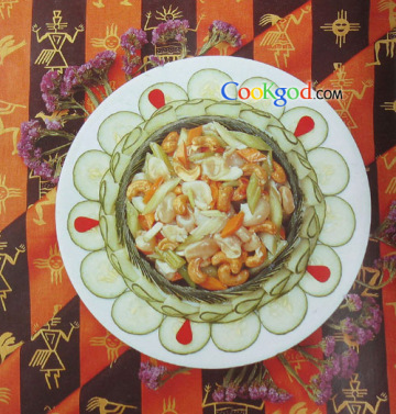 田鸡扣250克,西芹粒150克,炸腰果150克,红萝卜粒5克,姜米、蒜茸、葱榄各5克,芡汤35克,湿粉10克,姜汁酒10克,麻油1克,胡椒粉1克,生油75克,食粉1.5克,绍酒10克。