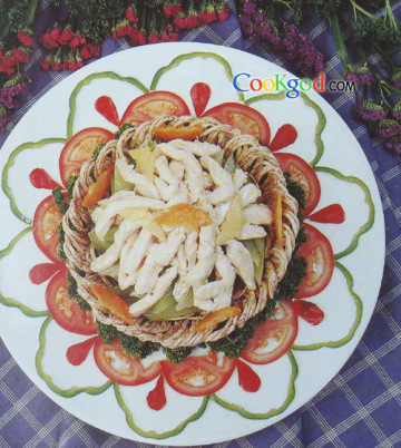 鸡柳200克,西芹300克,芡汤35克,湿粉10克,姜花5克,红萝卜花5克,蒜茸5克,用芋丝炸好雀巢一个,麻油、胡椒粉适量,精盐5克,二汤100克,生油75克,蛋白5克,绍酒10克。