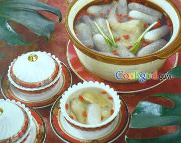 鹧鸪、(月每)肉改刀成小块状焯水,火腿切成厚片,将各种主配料放入砂锅内,注入二汤、料酒,旺火烧开,转小火煲2小时,放入调味品,最后加浸泡好的枸杞,再煲至汤沸,原煲上席。