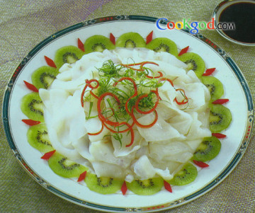 1、鲜墨鱼切薄片,入沸水锅中灼至成熟。