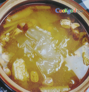 竹荪、粉皮先焯水。沙锅上火, 加入高汤、竹荪、粉皮、绍酒,小火煲20分钟,用精盐、味精调味即可。