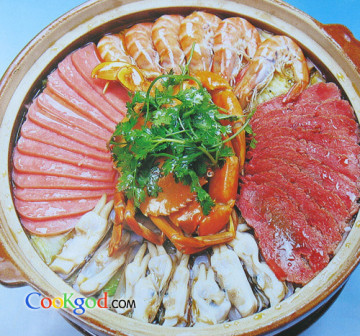 白菜焯水后与粉丝同放入沙锅垫底,将基围虾、蛏子清洗干净,与牛肉、方腿分成4等份,扇形排放在沙锅四周,将杀好的青蟹放在沙锅中间,注入鸡汤,放入姜片,用精盐、味精调味,上中火炖20分钟即可。