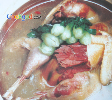2、沙锅上火,放入老母鸡、火腿、野山菌、清水、姜、葱、绍酒,用大火烧沸,撇去浮沫,移小火上炖制约2.5小时,待汤清、鸡肉酥烂入味,放人青菜心,加盖煲5分钟,加入精盐、味精调味即可上桌。