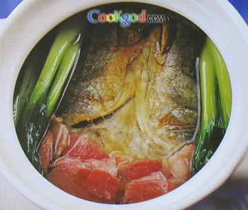 2、炒锅上火,加入熟猪油,放入生姜略煸,放入咸黄鱼、咸肉、绍酒、草菇、青菜略炒,倒入沙锅中加入鸡清汤煲20分钟、用精盐、味精调味,撒上白胡椒粉即可上桌。