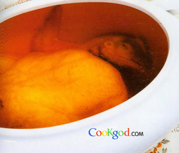 (1)三黄鸡整鸡出骨,鸡身用加料酒的开水烫变色取出,冷水洗净,翻正待用;