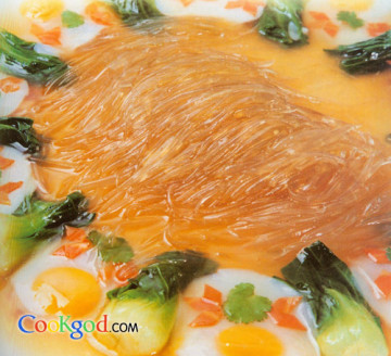 (4)滚热的鱼翅沥汁装盘,同时起锅加上汤1000g,精盐3g,味精2g,鸡粉2g烧开,撇胡椒粉,勾芡,浇在菜上面即好。