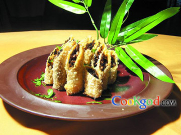 2、豆皮用40℃的温水浸泡20分钟,将蒸好的原料放在豆皮上,卷起成直径为3厘米的卷,在豆皮的外面再裹上威化纸,裹匀鸡蛋液后粘上面包糠即成生坯。