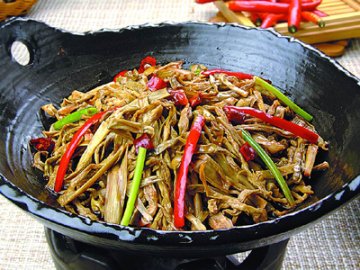 3、锅内放入茶油,烧至七成热时放入五花肉小火煸炒至色泽淡黄,下入烤笋、干辣椒节再用小火煸炒1分钟,入高汤小火煨5分钟,用盐、味精、葱白、鸡精调味,出锅装入干锅内,用红椒条、芹菜段、葱叶点缀后上桌即可。