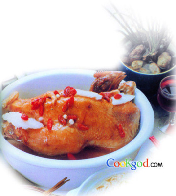 主料:肥土鸡1只(重约1500克)。调料:盐7克,味精2克,冰糖25克,胡椒3克,料酒25克,姜块、葱结各25克,红参20克,枸杞30克,淮山30克,阿胶30克,熟地15克,苡米20克。