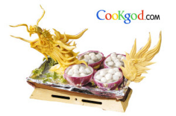 1、金瓜刻成舟状,蒸熟后摆入盘中。