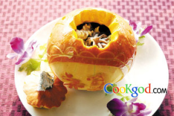 1、南瓜雕刻成金元宝形,用高汤煨制入味。