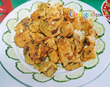2、炒锅内加油烧至五成热,肘子块挂匀糊下入油中炸至外皮焦脆捞出。
