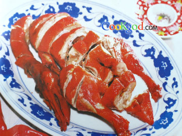 嫩肥鸭1只,葱25克,姜15克,红曲汁25克,料酒50克,精盐10克,白糖15克,八角5克,花椒3克,香油20克。