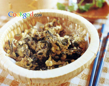 3、沥干水的茶叶粘裹蛋糊,逐一入油锅中炸呈金黄色即成。