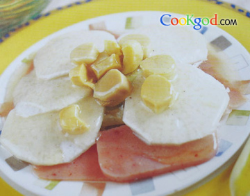 3、碗底中间放干贝,旁边围火腿,再将萝卜片排放汤碗中,加入鸡汤和蒸干贝的水以及冰糖、精盐、葱段上笼用旺火蒸约45分钟取出。