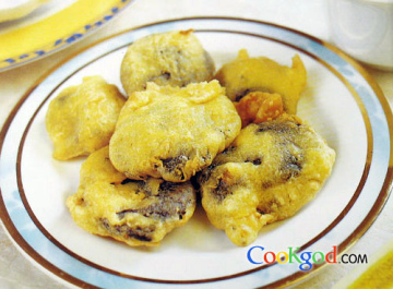 3、冬菇粘裹鱼蛋糊,入油锅炸至浅黄色即成。以甜面酱佐食,菇香味浓。