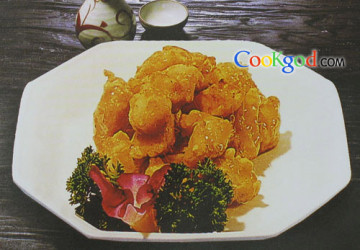 技术分析:如果一遍炸熟,原料受热多,本身所含水分必然外溢,由于受到外裹糊浆的阻挡而存在于原料和糊浆之间。易使原料与糊浆层分离、脱落,导致拔丝失败。所以,必须用较高的油温对原料进行快速炸制,这时糊浆已成熟,原料则稍微受热。待油温升高后再进行第二次快速炸制,使原料和糊浆所含水分溢出,同时使糊浆层形成焦脆、结实的外壳,这样就可以避免原料与糊浆分离、脱落。