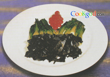 2.石耳焯水后,放入油锅中调味炒熟出锅。将少许石耳摆放在叶子中间,其余的石耳摆放在叶片的底部,摆成万年青的根基。