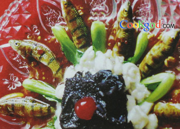 3.锅内加少许色拉油,下姜、葱炒香,加料酒,下小石斑鱼调味烧熟,围于盘边。
