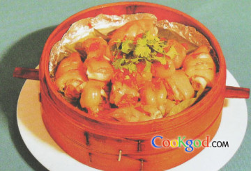 2.蒸笼垫上粽叶,放入拌味后的猪手尖,急火蒸烂熟,撒上红椒粒,淋入热油即可。