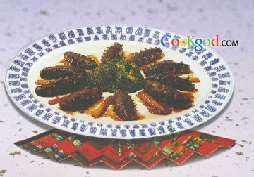 2.京葱段过油与熟海参同烧,放调料调味勾芡装盘。
