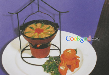 2.取砂锅下高汤、豆腐丝煨煮,下调料调味后加入青菜心、火腿丝上桌。