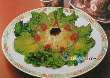 2.取碗,将火腿整齐地顺时针方向摆好,装入调好味的冬笋丝,上笼蒸熟取出扣在盘中,淋上芡汁即可。