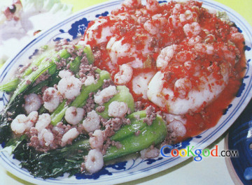 1、将油菜、娃娃菜均从中间顺长剖开成两半。红椒剁碎。羊肉剁成末。鲜虾仁治净,用料酒5克、精盐1克腌渍入味,再用湿淀粉5壳拌匀上浆。