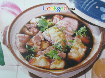 4、沙锅内放上葱结,下入猪五花肉片,鸡腿肉片、姜片、八角、加鸡清汤,酱油,猪油、白糖烧开,至鸡肉熟烂,下入鱼块,精盐,继续(火靠)熟,拣出葱、姜、八角,放上香菜段即成。